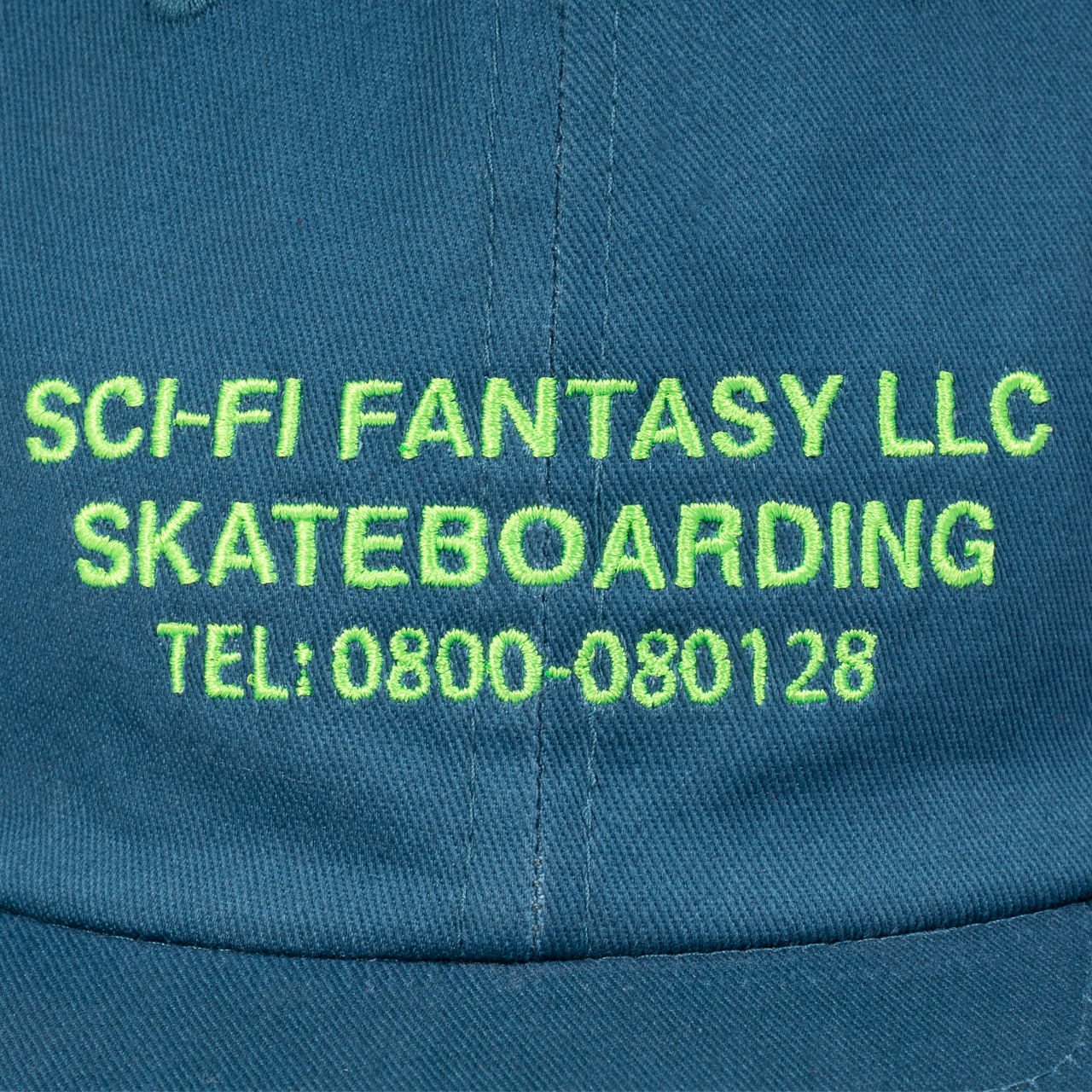Unstructured 6 panel cotton twill hat with embroidered front artwork. Custom Sci-Fi Fantasy interior seams. Plastic snap back.
