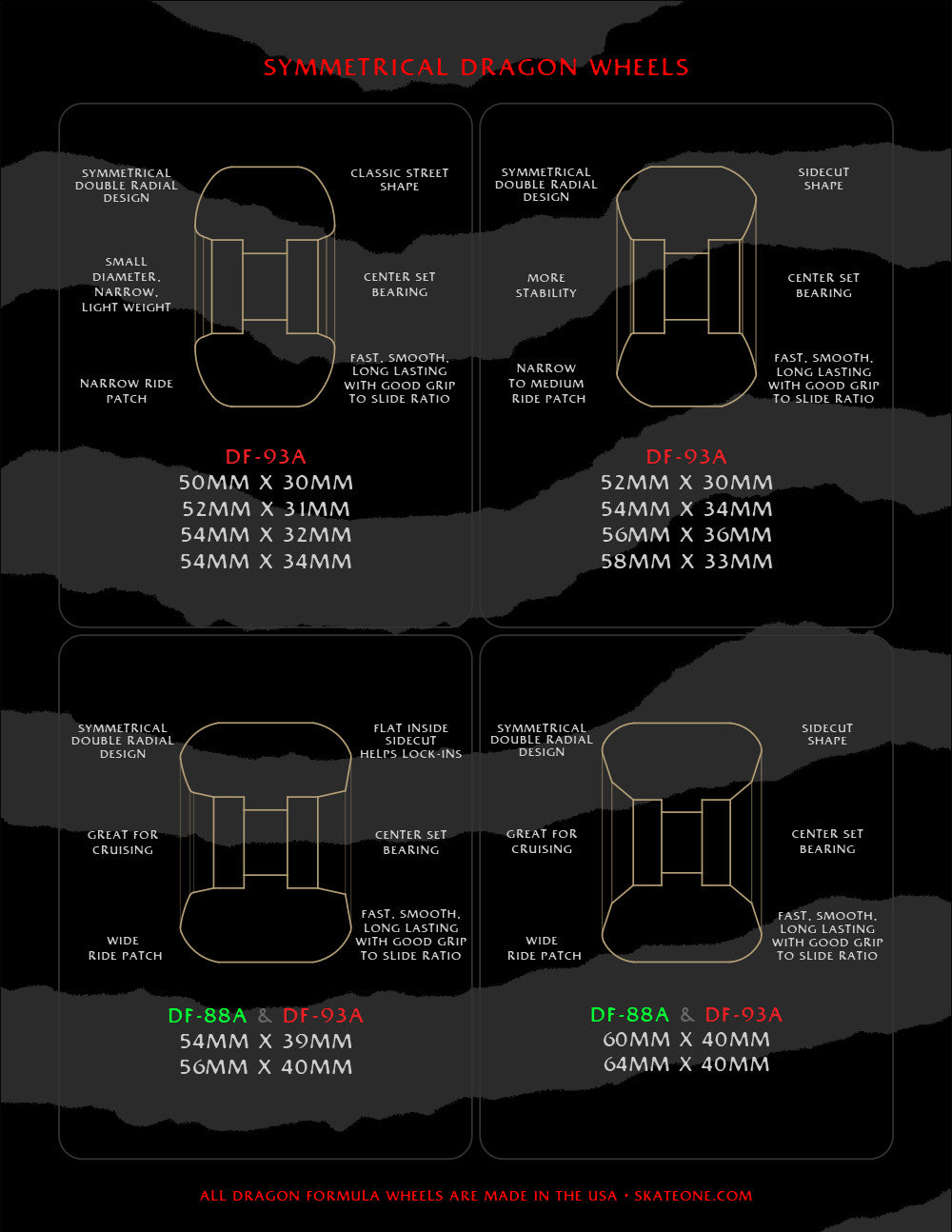 About Dragon Formula: The amazing new Dragon Formula™ (DF) Urethane used to create these wheels is another industry leading innovation from Powell • Peralta. DF-93A Dragons will not only roll over rough terrain, but also grip and slide like 99A and 101A wheels do, so that you can do all your normal tricks and more on the greater range of skate terrains made skateable by its softer 93A hardness.
